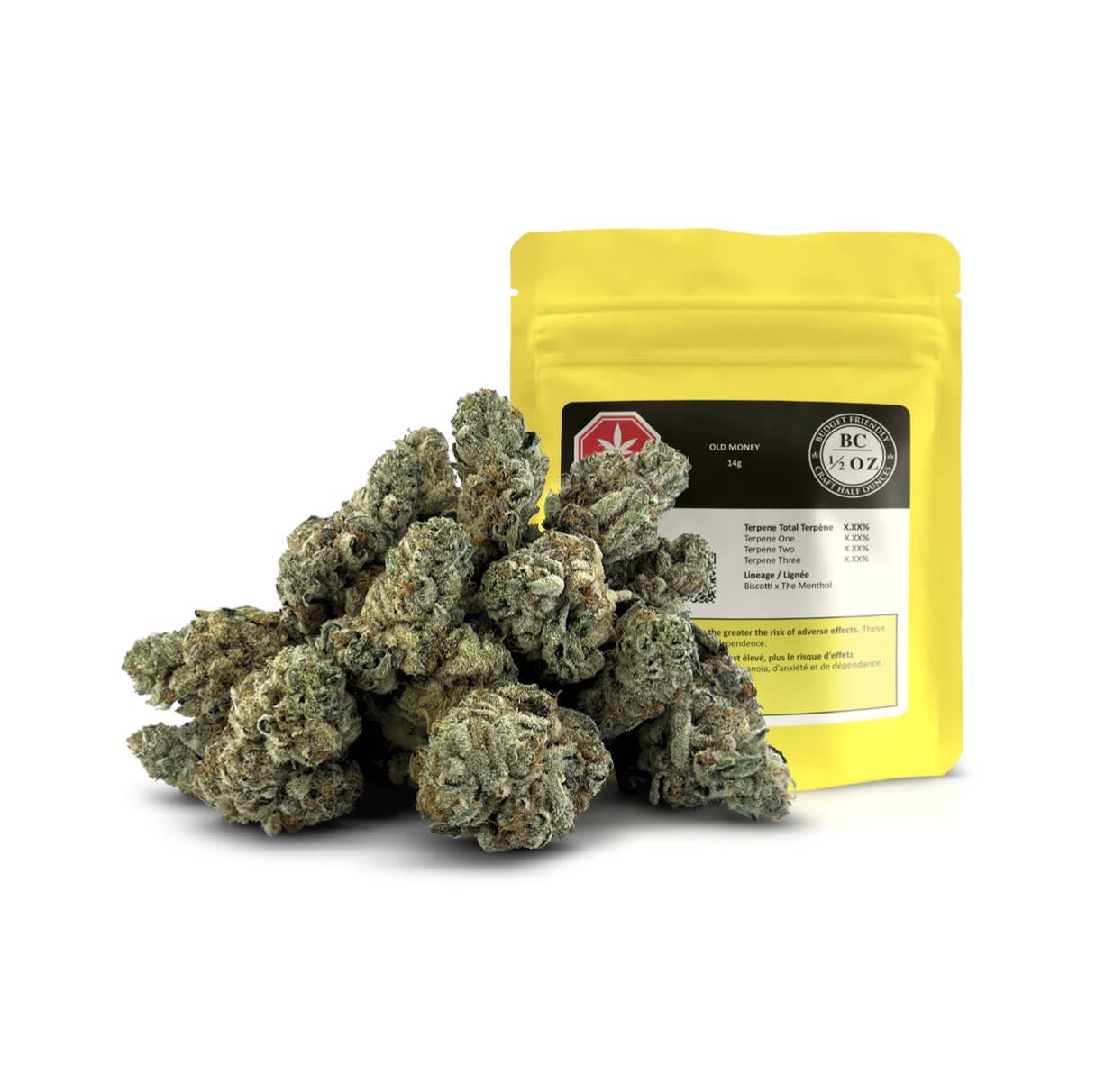 Old Money joins the BC 1/2 OZ line as a hybrid cross of Tribute and Eye Candy. The flower form rounded, dense heads with a tidy, well-stacked structure, showing moss-green tones with cooler slate hints beneath a thick crystalline sheen. Aromatically, it leans into polished sweetness up front, followed by a brighter, candy-like lift and a clean herbal edge, rounded out by a grounded, forest-like note. Old Money delivers a solid cut with a confident, refined presence.