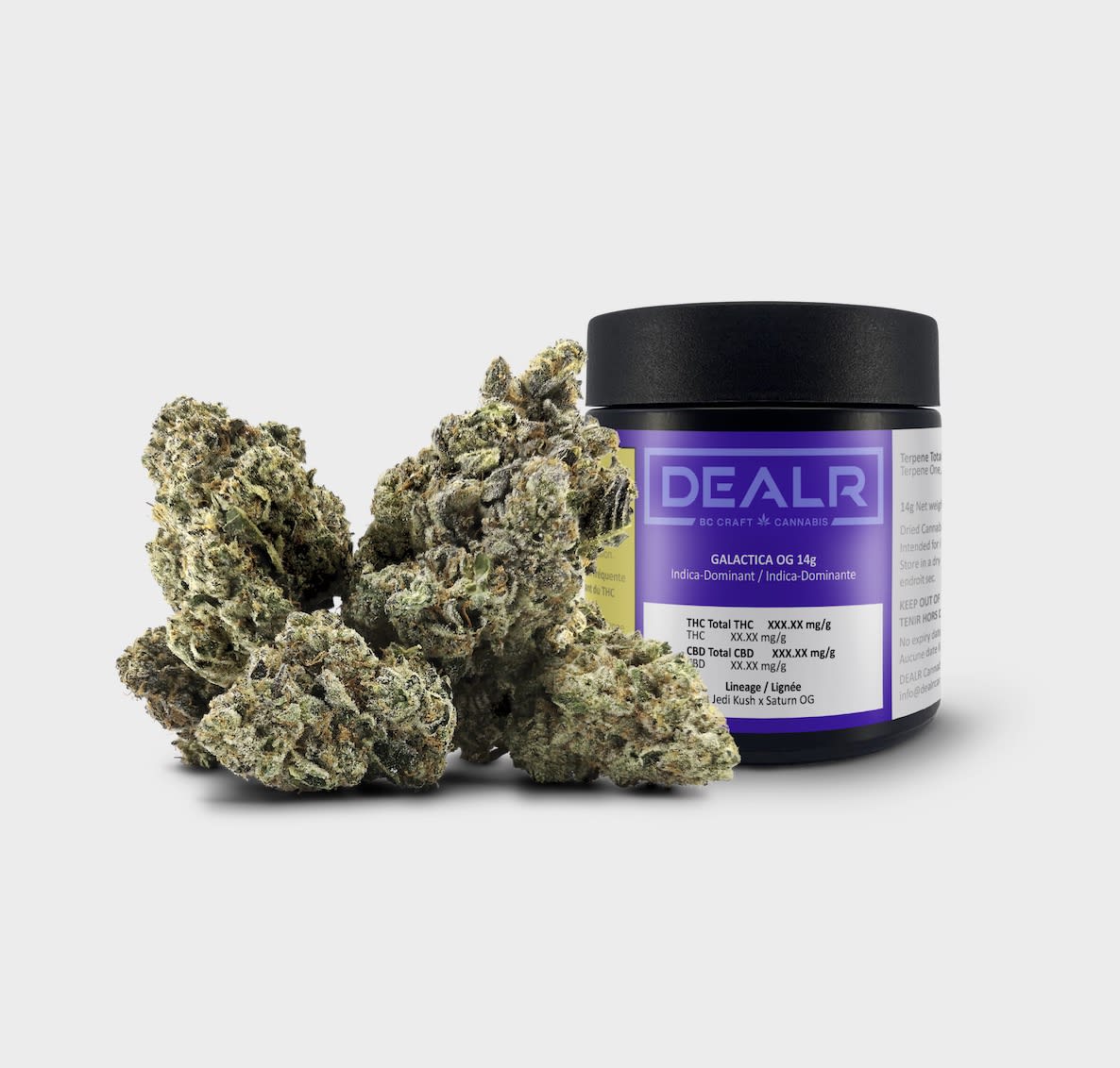 Galactica OG is a rare indica-dominant flower, created by crossing Jedi Kush and Saturn OG. Grown by Krazy Krystal in the Shuswap region of BC, the pungent aroma is dominated by skunk and fuel, with a sweet, earthy finish. The flowers are round, emerald green with deep purple undertones, and have sunny orange hairs with a frosty coating of amber trichomes. High-THC levels make it clear why this offering was aptly named Galactica OG—a beautiful, BC-grown Kush that connoisseurs will love. Terpenes include beta-caryophyllene, limonene, and myrcene.