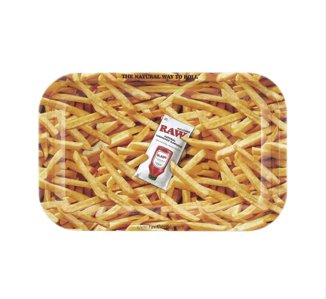 You love french fries? So you must love this RAW french fries trays full colour realistic print. It is the perfect accessory for daily sesh lovers. Made from food safe materials, the tray can be used with mag slaps as storage for all your accessories or a rolling tray. The curved edges keep everything on board without rolling. And with a long lasting non-stick finish, washing a rolling tray doesn't get this easy. Get this tray in small or large sizes. RAW Rolling Tray Features: Size: Small & Large Small Dimensions: 11" x 7.5" Large Dimensions: 13.5" x 11" Tasty French Fries Theme Full Colour Print Food Safety Grade Impressive Portability Super Washable Permanent Non-Stick Finish Extremely Lightweight Curved Edges Prevent leakage High Quality Metal Frame for Extra Durability